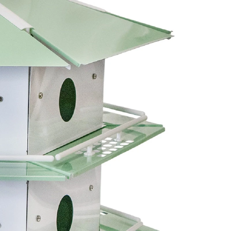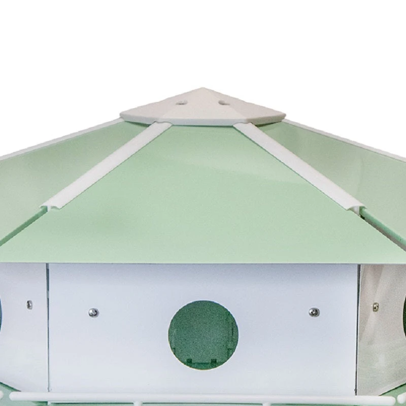 Encourage martins to establish a colony in your yard by adding this Heath Aluminum Two-Story Premium Martin House to it. These migratory birds are often a welcome resident in a bird sanctuary, as they provide a bit of natural pest control by dining on insects, as well as herald warmer months. This sturdy, dual level shelter offers nesting sites for up to 12 martin families, while the hexagonal shape creates ample, triangular compartments for their safety. This design also places the 2.1875″ diameter entrance holes offset from one another, diminishing porch territory disputes. Oblong openings in front of these entries provide drainage, and plastic porch rails insert here for additional resting and preening spots. The plastic, interior panels lock into place for straightforward and sturdy assembly, while the aluminum exterior resists rust for a lasting shelter. The white tone of each wall also dissipates heat, keeping nestlings cool, and any warm air can readily exit through the top, plastic cupola. A green, six sided roof covers this domicile for protection from the elements, enhancing the white of the body and your verdant garden. Each level of the home, along with this roof, separate readily for thorough nest checks and maintenance, and are held in place on a pole via set screws for a unique showcase. Sturdy, plastic stabilizers slide over an existing 1.25″ outer diameter pole (not included) to mount the home at the appropriate height, and the compartments can be closed in the winter months by adding the included, plastic door stops to them. This prevents more aggressive birds from overtaking the home when martins are not present. Reliable aluminum and plastic construction ensures this shelter becomes a fixture in your backyard bird garden, and the interlocking design makes for streamlined assembly. Help young martins start a colony in your yard when you place this Aluminum Two-Story Premium Martin House in it. Assembly required. Made in the USA.