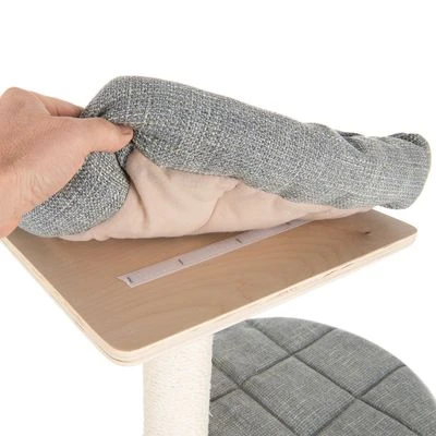 The Ankara Cat Tree Promotes extensive scratching and stretching. For this purpose, natural wood trunks are used, which are partly wrapped with sisal. Your cat can make themselves comfortable in the spacious little house, in the comfortable bed, on the viewing platform or in one of the two hammocks. The upholstery of the cat scratching post is made of easy-care furniture fabric and can be easily removed.