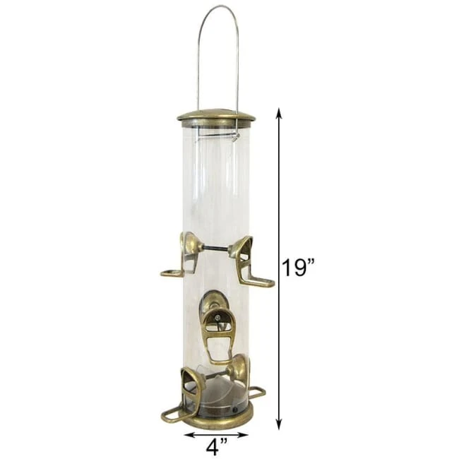 Keep your bird garden full of feed and birds using the Aspects Big Tube Wild Bird Feeder, Antique Brass. This significant garden addition will certainly bring several birds to your area, creating a wildlife haven for you to enjoy. The 4″ diameter seed tube holds a generous 3 quarts of sunflower seed, safflower seed, cracked corn, or mixed seed, to offer birds a wealth of feeding options. The six ports allow a few birds to dine at once, and the “U” shaped perches are specifically designed with avian comfort in mind. These perches enable cardinals and a bevy of other birds to feed easily, and each of the ports has a wider opening for them to reach seed. The antique brass color of the metal ports, perches, roof, and base bring a classic feel to the item, while forming a durable and lasting feeder. An internal baffle at the base of the seed tube prevents seed buildup, and the innovative, Quick-Clean design helps the item remain clean and hygienic. Squeeze the plastic tabs on the bottom of the metal base to remove it from the seed tube in moments, for easy disassembly and thorough cleaning. Slide the metal cap up the attached hanger to refill the unit, and hang this station from a hook or branch for easy visibility. For added versatility, the feeder may be pole mounted using a 3/4″ threaded adapter (not included). Its UV stabilized, polycarbonate reservoir and metal accents enhance the quality of this feeder, creating a durable unit you may enjoy for several seasons. Invite birds into your yard with this Antique Brass Big Tube Wild Bird Feeder. Made in the USA. Lifetime manufacturer’s guarantee.