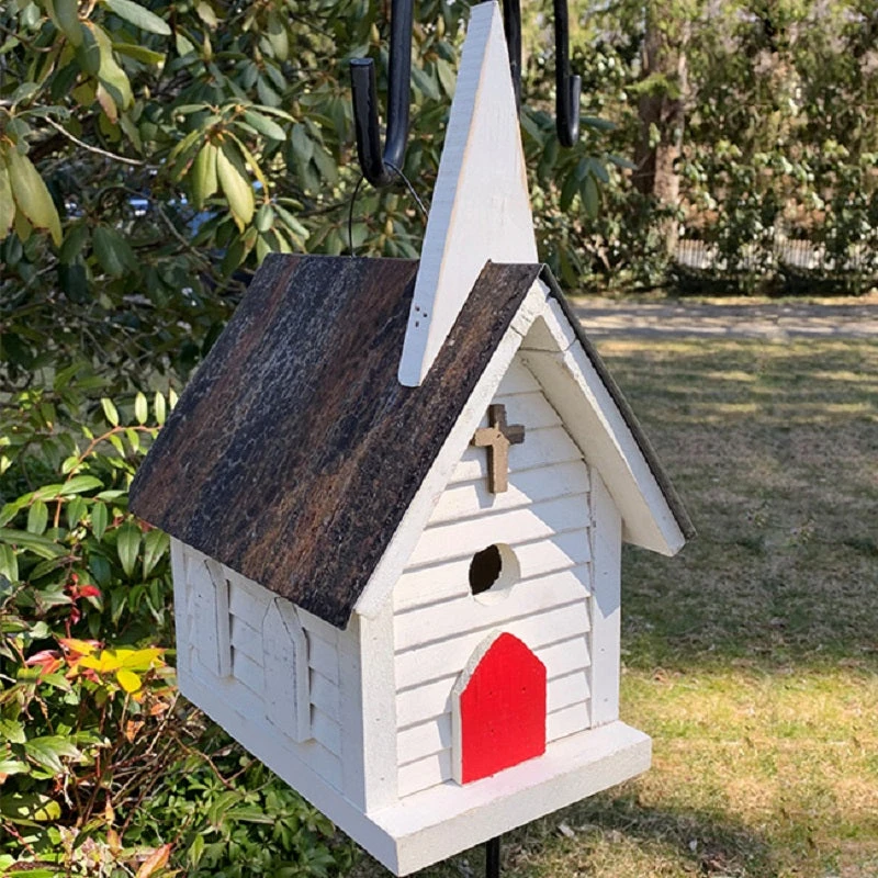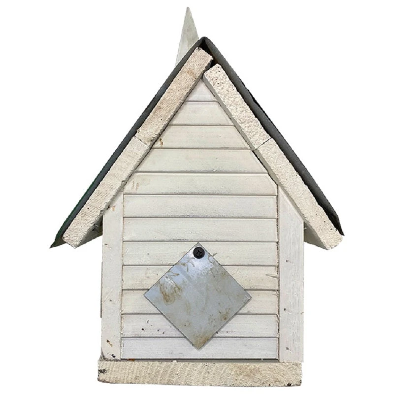Add a hint of the sacred to your yard with this Bird in Hand Cameron Country Church Bird House. Masterfully crafted by the Amish in eastern Pennsylvania using reclaimed and recycled barn wood and with an entry hole of 1.25″ diameter, this bird house is perfect for chickadees, finches, titmice, and wrens. Constructed in the image of a church, the house conveys a sense of awe with its stately scale model red doors, holy cross, and majestic steeple which adds even greater height to the piece. A convenient small metal panel on the back of the house slides open to reveal a 2″ diameter hole for nest inspection and cleaning while keeping out unwanted visitors. Small gaps under the roof and walls of the church provide ventilation for the inside of the house. The pitched roof is enhanced with sheet metal for durability and overhangs the entry hole, helping to keep the roosting birds inside dry. A wire on top of the house makes hanging the piece simple, or the flat base can accommodate a mounting plate for displaying on a pole or post. The recycled and reclaimed wood construction lends it an environmentally friendly air. The birds in your yard will exclaim “Hallelujah!” when they see this Cameron Country Church Bird House. Made in the USA.
