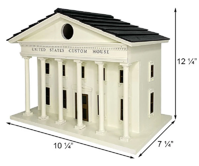 Give birds a chance to settle into your backyard using the Home Bazaar Charleston Custom House Bird House. This spacious, wooden home mimics the Greek Revival architecture of the real-world US Custom House in Charleston, SC, from its painted off-white finish and building name across its front, to its six columns and arrangement of windows and door. A 1.25″ diameter bird entrance sits within the front gable of the home, protected by the roof overhang above, while a 8.25″ x 5.5″ panel on the back is removable for routine cleanings. The interior of this generous home contains two holes in its base for adequate drainage of any accumulating moisture, as well as gaps between the sidewalls and the roof for ventilation, making a comfortable nesting spot. A mesh ladder also adorns the interior, ascending the interior of the front wall and creating easy access for birds to the entrance from the inside. Opposite the painted black, wood shingles decorating the roof is a 10.25″ x 7.25″ base on which the home sits, ideal for mounting atop a post with an appropriate mounting plate (not included), while the back of the house has affixed to it a swiveling, dog-eared plank for mounting the structure to a wall or side of a post. Hang a decorative taste of historical Charleston charm in your yard with this Charleston Custom House Bird House.