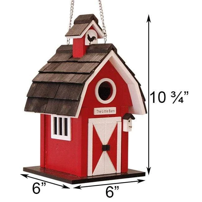 Stylishly showcase your love of agriculture and barns with this Home Bazaar Classic Red Barn Bird House. The familiar shape and traditional color scheme create a recognizable accent in your garden, while its wooden construction lasts for many seasons. A bright red tone covers all four sides of the shelter, and white trim around the faux windows and soffit offer contrast. A cupola tops the home, and a rooster silhouette completes the look. A 1.25″ diameter entry sits beneath the gambrel roof, leading to a spacious chamber. This offers small songbirds a fantastic roosting spot, and screening on the interior allows nestlings to reach the exit. Slots beneath the roof overhang help regulate the interior temperature. A small hole on the flat, black base provides drainage for the nest, and the back of the piece unscrews for seasonal maintenance. An attached chain makes it easy to hang the home from a bracket, or the base can be placed on a level surface for a different look. Bring bright color and familiar shape into your bird garden with this Red Classic Barn Bird House.Â
