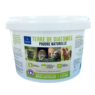 Diatomaceous earth, also called diatomaceous earth, is used in many areas. The Diatomaceous Earth from Demavic, which you can get here in the practical 1.5 kg bucket, is primarily used to control vermin / pests / insects in animal housing and other areas in the house and yard. It is a 100% natural, amorphous, non-calcined product that is safe for humans, pets and plants.