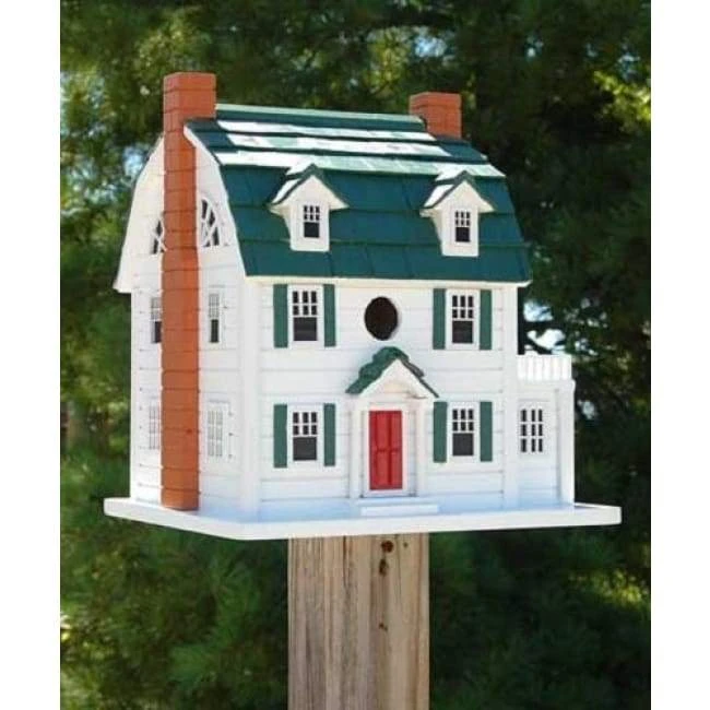 Invite birds to frequent your yard by placing the Home Bazaar Dutch Colonial Bird House in it. The gambrel roof, distinctive faux windows, and dual dormers lend a classic, familiar look to this unit, and its white and green colors offer a natural hint. Faux chimneys flank the home, their orange color contrasting the white siding and green roof. The generous home provides plenty of room for an avian family, and its bevy of window shapes enhances the spacious feel. A 1.25″ diameter opening rests above the red door, for birds to easily access the home, and the gambrel roof overhangs this entry slightly to protect it from rain. This overhang also creates a ventilation gap on both the front and back of the home, ensuring it remains comfortable for nestlings. They may reach the top opening to exit the unit using the attached screening as a ladder, and the portico offers them a takeoff or landing spot. Two drainage holes on the base of the roost help any captured water escape the nest, and this significant platform also allows the item to be mounted to a post or pole with a mounting bracket (not included). The wooden construction enhances the classic lines, while the color scheme heightens the style. Place a timeless abode in your bird garden using this Dutch Colonial Bird House.