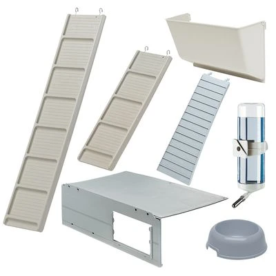 - Included in delivery: 600 cm³ drinking bottle, hay rack, resting house, plastic ladder, 0.3 L feeding bowl