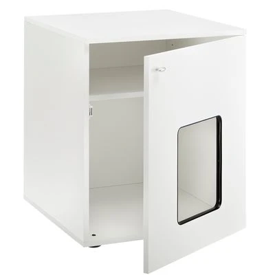 This modern white cupboard with magnetically-closing door & access hatch. It is ideal for concealing a litter tray or as a place for your cat to relax with an adjustable shelf for storing accessories.