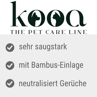 The absorbent mat consists of bamboo fibres, among other things, which ensure good fluid absorption . This prevents wet dog paws. Inside the kooa training mat with bamboo for puppies is a silicate gel that serves to neutralise urine odour . Thanks to four corner stickers , the pad can be easily fixed to the floor or in a transport box.