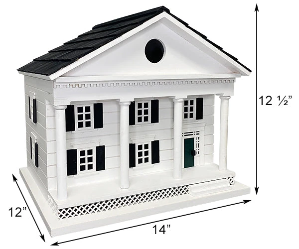 Revive bluebird populations in your yard by offering a nesting couple this Home Bazaar Madison Manor Bird House as a roosting spot. Adding bluebird-specific housing to your yard provides these bright birds a safe nesting site, encouraging population growth. This ornate, neoclassical roost brings a familiar look to your landscaping, perhaps even matching your own home. Dual levels of windows with shutters throughout the all white body accent its height, furthered by a shingled, pitched roof. Four Doric columns line the front porch, framing the green door and supporting the top level. A 1.5″ diameter opening sits beneath the roof ridge, inviting birds to enter the piece, and its generous, unpainted interior offers plenty of room for an avian family. A band of netting beneath the entry helps fledglings climb upward toward it when ready, and an interior ledge beneath this opening prevents predators from marauding the nest. Remove the back panel to check your avian tenants, and use the included, 5.125″ square mounting bracket to place this home atop a wooden post easily. The black paint on the roof and shutters perfectly contrasts the white on the rest of the unit, and the recognizable, Greek revival design transforms it into a piece of functional art. Revitalize the look of your flowerbed and invite birds to nest in the area with this Madison Manor Bird House.