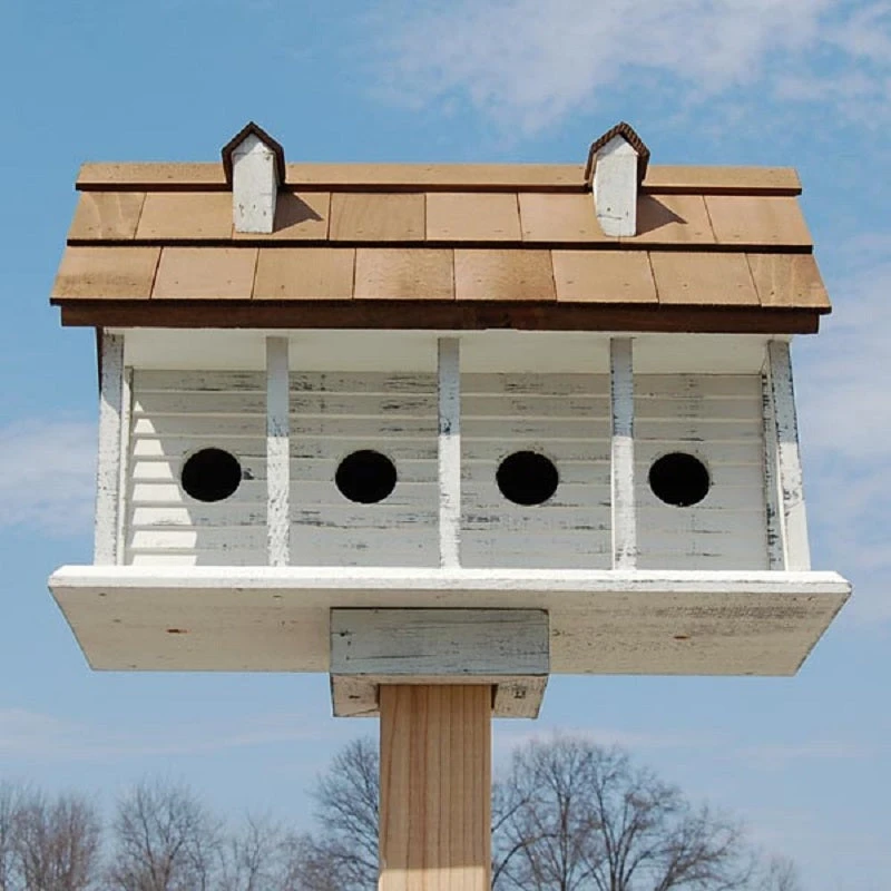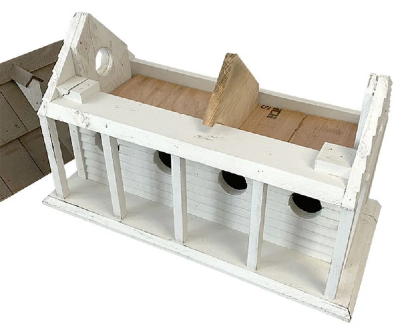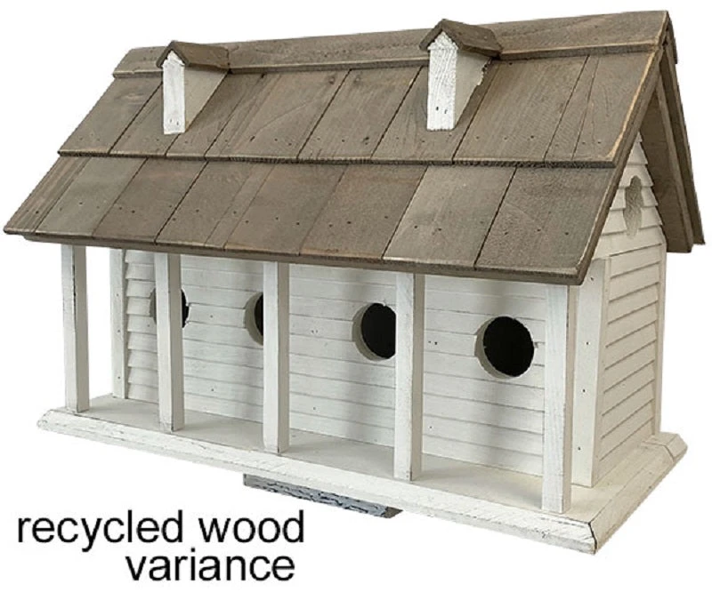 Begin a martin colony in your garden by placing this Bird In Hand Martinsburg Purple Martin Manor in it. This detailed, wooden piece offers a rustic hint to your backyard, while providing six martin families a lasting shelter. Four 2″ diameter openings line the front of this abode, while two additional entries on the top level offer more space for birds. The home’s antique white body and tall, pitched roof help regulate the interior temperature of each nest, assisted by the reclaimed wood construction. This design reduces landfill waste, and lends extra charm to your garden. Lapped detailing on each side of the shelter enhances the realistic hint, and five columns along the front visually divide the piece. These columns also support the porch roof, overhanging each entry, and a significant base provides landing and perching spots. Holes on this base also allow any captured water to drain from the nests, and an integrated bracket here makes it simple to place the home on a wooden 4 x 4 post (not included). The roof lifts easily for nest checks and seasonal maintenance, and two faux dormers here add a classic look to the piece. The weathered finish lends dimension to your bird sanctuary, while the reclaimed wood body offers strength for many seasons. Offer martins a rustic retreat with this Martinsburg Purple Martin Manor. Made in the USA.