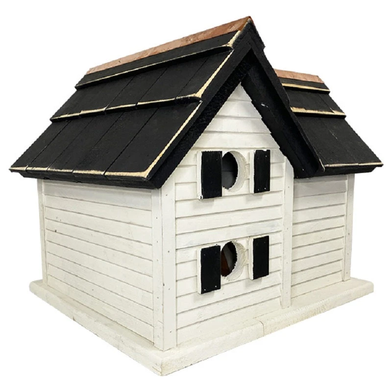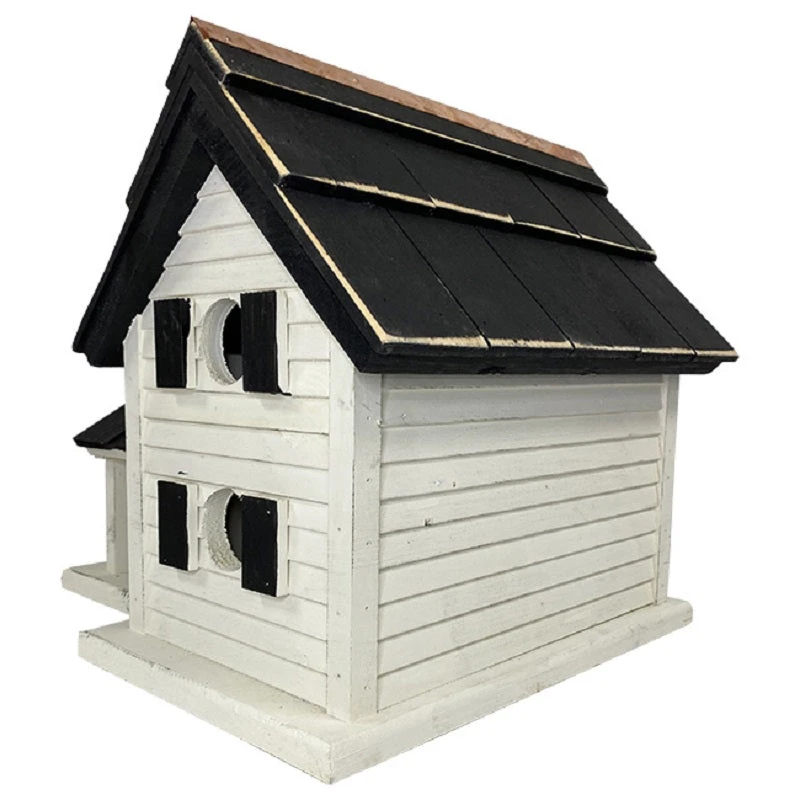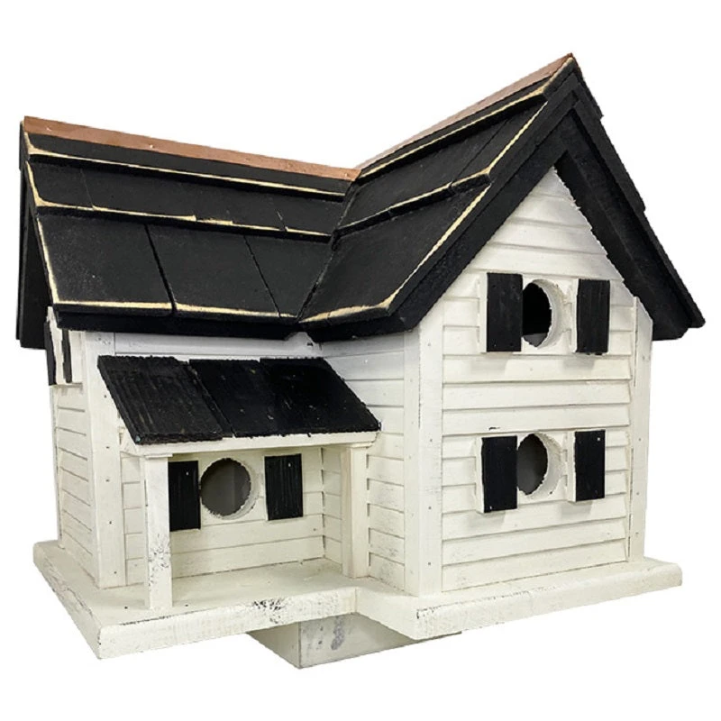 Invite purple martins to reside in exquisite style with this Bird in Hand Montgomery Purple Martin House. Hand crafted with reclaimed and recycled Amish wood, this substantial bird house is soundly built while offering a charming, natural sensibility to your yard. The 8-room shelter is reminiscent of a traditional, white two-story house, replete with wood siding and black blocks positioned beside the half dozen, 2″ diameter entry holes to approximate classic window shutters. The pitched roof’s black tone and copper colored ridging pleasantly contrast the white walls and overhangs each of the entryways, keeping roosting martins dry while also remaining easily removable for nest checks and cleaning. Gaps below the roof add ventilation, and an integrated bracket on the bottom of the home makes for easy mounting on a standard 4 x 4 wooden post (not included). Each home is deliberately distressed to provide a more weathered appearance, bolstering its rustic charm, and the white coloring appeals to martins while keeping the compartments cool in the summer heat. Boost your yard’s natural beauty and beckon purple martins to stay year after year in this Montgomery Purple Martin House. Made in the USA.
