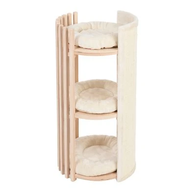 The scratching barrel offers three sleeping areas on top of each other, meaning that this accessory requires less space. It fits perfectly in the corner thanks to its round shape. The solid construction using real wood for the platforms and other elements makes this scratching barrel particularly stable and sturdy.Â