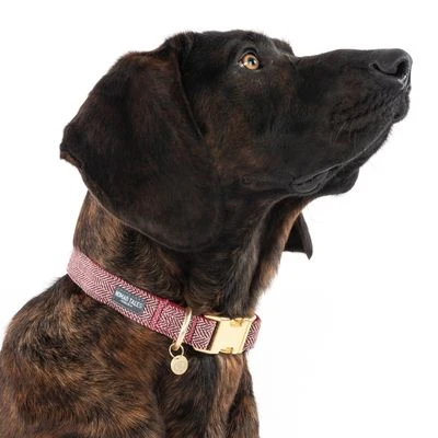 While most dog collars have plastic fasteners or metal elements in silver, the Nomad Tales Calma collar, burgundy stands out from the crowd in a noble way: Here, the metal parts come in an elegant matt gold look and perfect the collar into a luxurious accessory for everyday use. The pleasant colouring, the pretty herringbone pattern and the decorative “Nomad Tales” badge give the collar a very special touch! To create a uniform look, the colour-matching leash is of course also available.