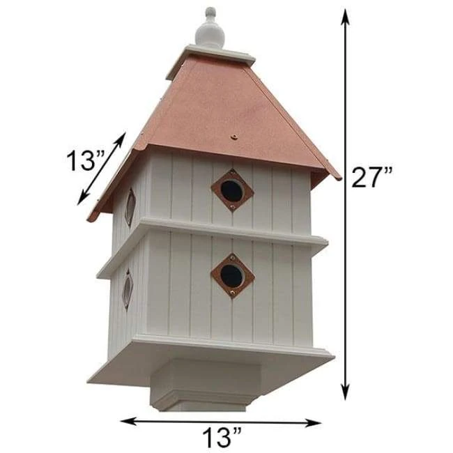 Invite a group of birds to establish a colony in your yard with the Wing and A Prayer Plantation Bird House with Hammered Copper Colored Metal Roof. This dramatic home houses eight separate birds at once, for constant avian activity. Ledges around the base of each level help visually divide the home, as well as offer a perching or takeoff spot for fledglings. Vertical panels lend a classic design look to the house, and the white color adds a crisp feel. Each 1.5″ diameter entrance hole is surrounded with a metal predator guard, matching the copper color and finish of the roof for added dimension. A white finial tops the piece, adding height to the unit. Remove the roof and each floor in the house for seasonal cleanings and nest checks, to keep it usable for the next year. The hammered finish on the copper colored metal roof adds an elegant look to the unit. Constructed of solid PVC trimboard, this house is designed not to mildew, mold, or delaminate with exposure to the elements, and will remain stable for up to 25 years. Use the preinstalled mounting collar to connect this home to a 4″ x 4″ post (not included), bringing height to the abode. House several birds in your garden with this Plantation Bird House with Hammered Copper Roof. Made in the USA.