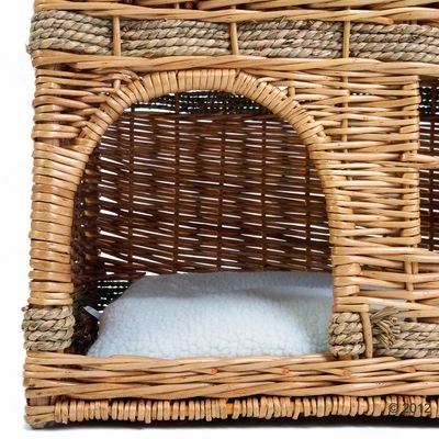 This extravagant and elaborately woven cat den made in a stylish Puebloan design has two floors: the lower floor is a snuggle den with a window for hiding and observing the territory. The upper floor is an observing platform for cuddly lounging and napping. Both floors are equipped with comfortable cushions.