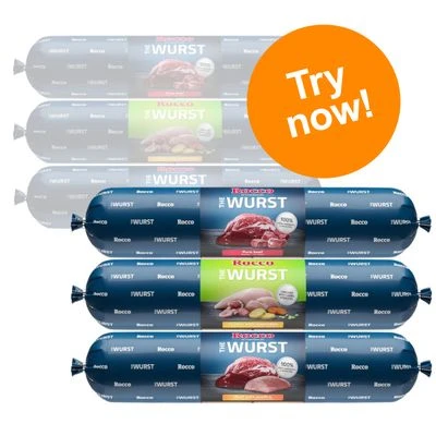 Rocco Sausage Wurst Mixed Pack contains three delicious flavours of complete wet food in sausage form. All varieties boast a high meat content and are made using 100% fresh high quality ingredients. They are gently prepared to preserve the intense meaty taste and keep irresistible meat chunks and invaluable nutrients from the ingredients. A wonderful choice for meat-loving dogs with a healthy appetite!