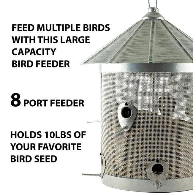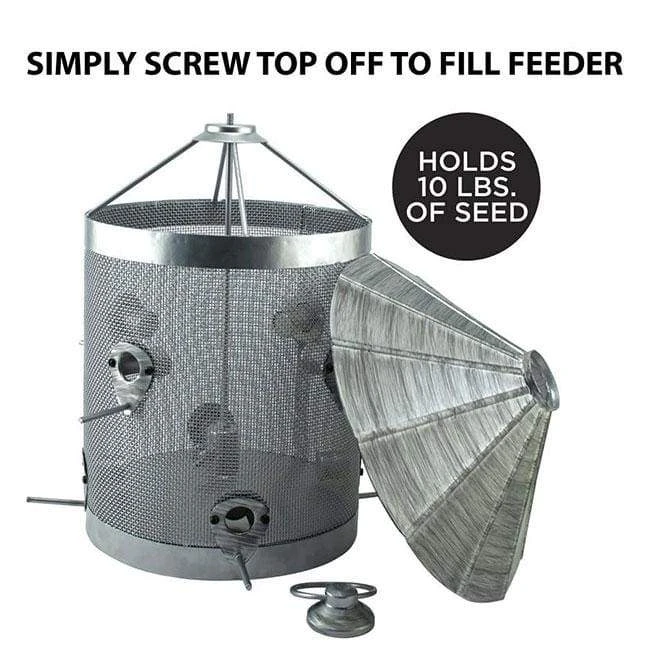Continue the country chic motif of your home décor into your landscaping with this Woodlink Rustic Farmhouse Mesh Silo Bird Feeder. The robust, steel construction and gray hues of this unit enhance its farmhouse style, completed by its classic shape. The cylindrical, mesh body holds 8.75 quarts of sunflower seed, mixed seed, or peanut splits, and 8 ports around the reservoir allow a few birds to dine. A perch beneath each port provides a spot for your feathered friends to rest and reach the seed, while clinging birds can grip the mesh cylinder for added avian activity. A generous, 12 paneled roof fully covers the reservoir, protecting seed from the elements, and a steel rod through the center of the piece adds strength and stability. Unscrew the top knob to remove the roof and clean or refill the item, and hang the feeder with the metal loop for easy placement. The unit can also be pole mounted using a 1” outer diameter pole (not included), and the steel construction forms a hardy station. Continue the timeless tradition of feeding birds by placing this Rustic Farmhouse Mesh Silo Bird Feeder in your yard.