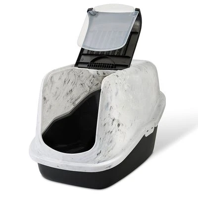 Closed litter tray in noble marble look, large swinging door, bonnet securely fastened with clips & easily removable, practical carrying handle, with activated carbon filter, dimensions: L 56 x W 39 x H 38.5 cm