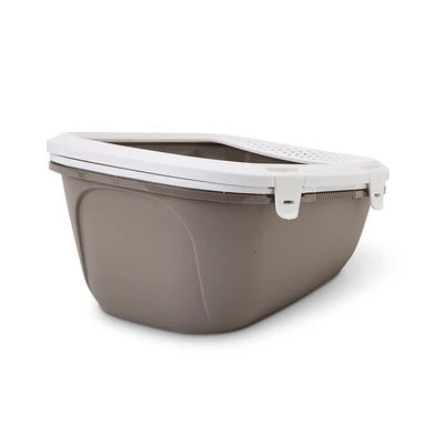 Spacious cat litter tray with sieve filter for easy cleaning and to ensure efficient use of litter, with a high back wall and perforated exit area, ideal for large breeds.