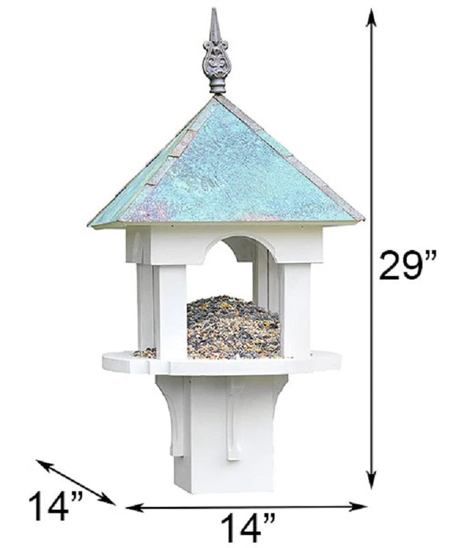 Offer seed to your backyard birds in luxury and style with the Heartwood Sky Box Café Bird Feeder. This beautiful, white feeder with verdigris roof adds a striking look to your bird garden at once, while holding plenty of feed for birds. The cellular PVC body creates the frame, and will remain bright white without rotting or warping for many seasons. The four upright columns support plastic panels, which form a reservoir capable of holding 3.75 quarts of mixed seed. Gaps on the base of each panel allow seed to exit onto the platform for birds to enjoy, and this area also provides plenty of resting spots for the birds. A hipped, copper roof covers this reservoir, the symmetrical sides mimicking that of the body, and its verdigris finish contrasts the white tone of the PVC frame. A cast iron finial adds height and drama to the feeder, and the roof may be removed for refilling and cleaning the item. Holes on the base platform allow any water to drain from seed, and the attached mounting collar slides over an existing 4 x 4 post for a quick and lasting display. Create a lavish feeding spot in your garden with this Sky Box Café Bird Feeder. Made in the USA.
