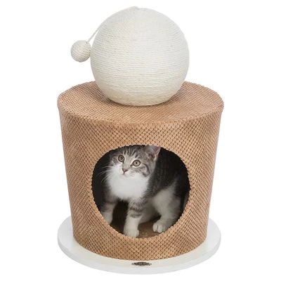Elegant and versatile: If you are looking for a stylish and imaginative scratching opportunity for your pussycat, the Trixie cave with scratching ball is just what you need. The small but fine scratching furniture scores not only with its noble design in a structured, earth-coloured soft plush look and heavy real wood top, but also with high functionality!