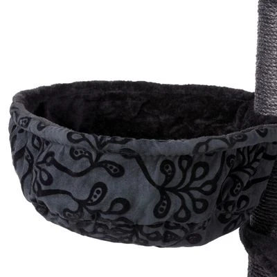 Stylish cat tree for large breeds, with striking black plush and floral velour covers, 8 12cm-diameter sisal posts, hammock, removable bed & rustle base plate. Dimensions: 77 x 58 x 114 cm (L x W x H)