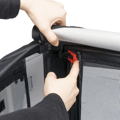 The foldable Trixie Vario Mobile Kennel is a versatile accessory, acting as a great pet kennel for when you’re away from home. No matter whether you are camping, travelling or simply staying away from home, this Trixie Vario Mobile Kennel offers your dog the perfect space to relax in. Floor straps and pegs included with the crate help to secure the kennel firmly to the floor. It is easy for your dog to enter the box as it can be opened on three different sides. A net insert all the way around allows for optimum ventilation in the kennel and can be closed when there is too much sun coming in or it starts to rain.Â